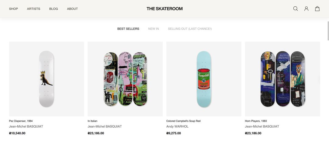 Так у 2014 році з'явилися Skateroom та її колекції, над якими працюють дизайнери компанії, художники світового рівня та знамениті артисти, які часто не байдужі до скейтбордингу. У колекціях бренду представлені твори таких метрів, як Жан-Мішель Баскія, Енді Уорхол і Джефф Кунс. Кожен витвір мистецтва підтримує певний соціальний проект: від створення безпечних скейт-майданчиків для дітей до розвитку скейтпарків для молоді. Правда ж приємна думка про те, що замовити скейтборди зі США в The Skateroom ― це сприяти світлому майбутньому?